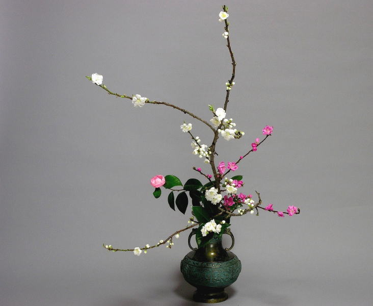 花材: 桃2種 (園芸品種 白・ピンク) 乙女椿